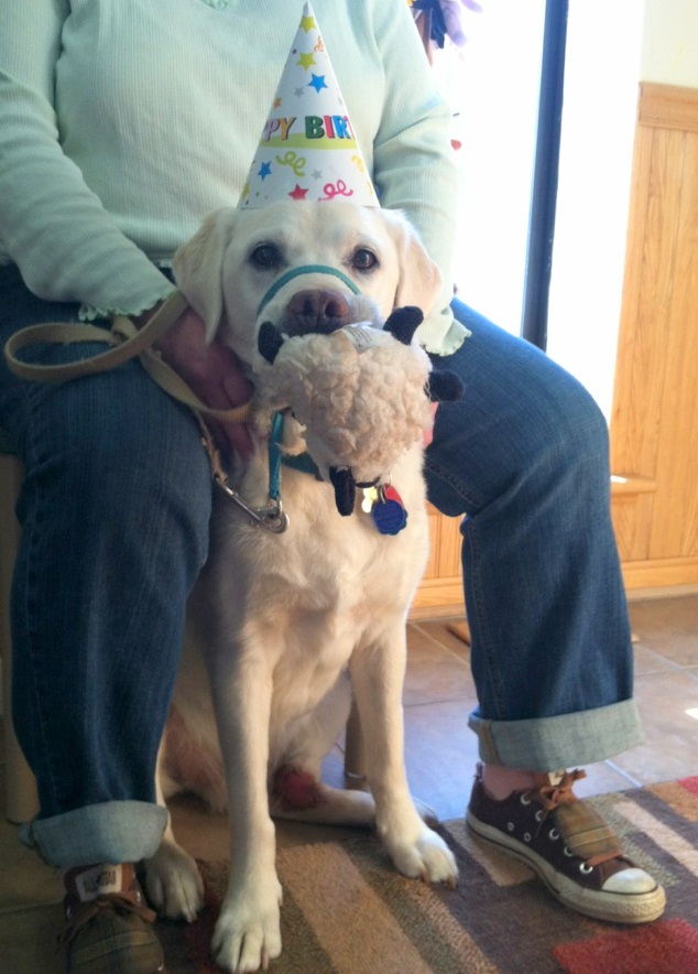 Arri arrived at treatment wearing his party hat. Everyone loved it. He even posed for pictures with the squeaky lamb in his mouth.